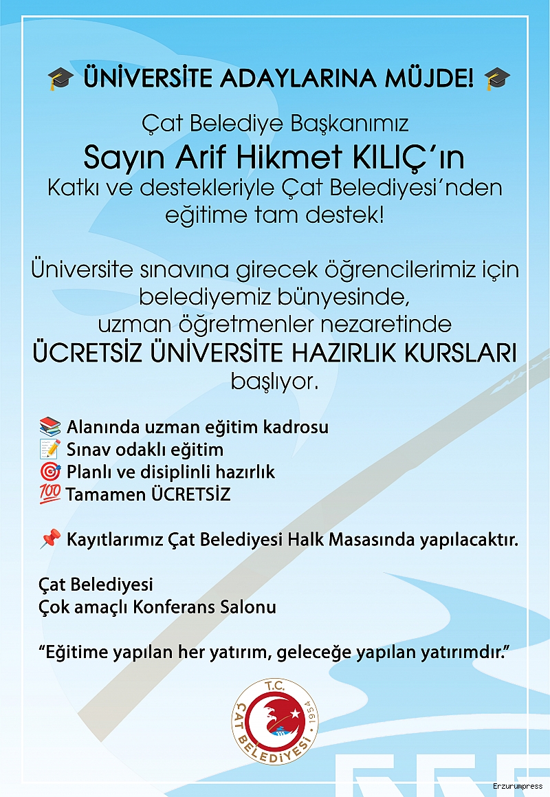 Çat Belediyesi, eğitime verdiği önemi bir kez daha ortaya koydu. Çat Belediyesi Belediye Başkanı Arif Hikmet Kılıç’ın katkı ve destekleriyle, üniversite sınavına hazırlanan öğrenciler için ücretsiz üniversite hazırlık kursları başlatılıyor.