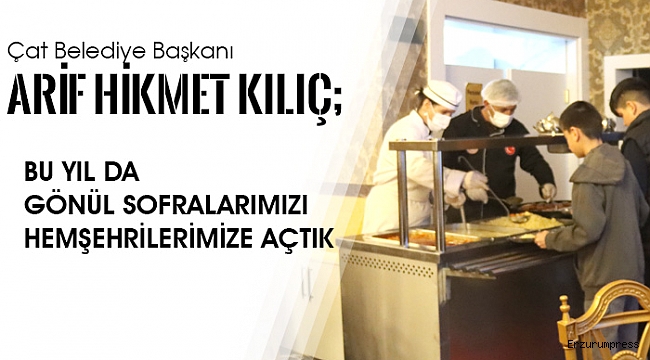 Başkan Kılıç, “Ramazan ayı; birliktir, berekettir, dayanışmadır. Bizler de Çat Belediyesi olarak her yıl olduğu gibi bu yıl da gönül sofralarımızı hemşehrilerimize açtık. Soframız; yolda kalmış bir yolcuya da, öğrencimize de, ihtiyaç sahibi kardeşimize de açıktır. Çünkü biz inanıyoruz ki paylaştıkça bereket artar, dayanışma güçlenir.” ifadelerini kullandı.