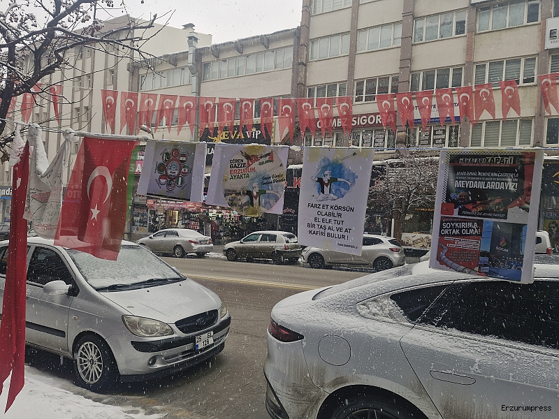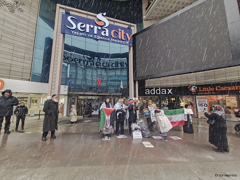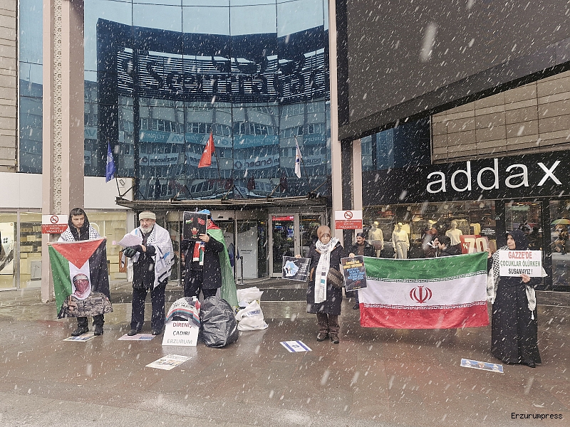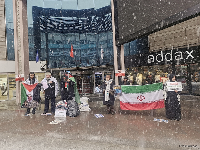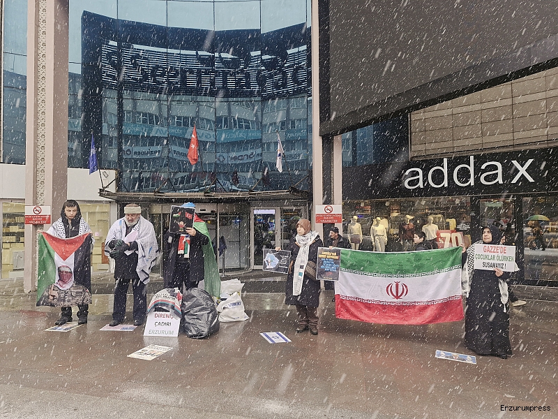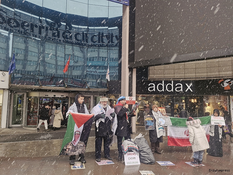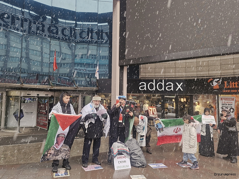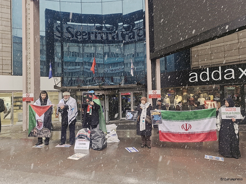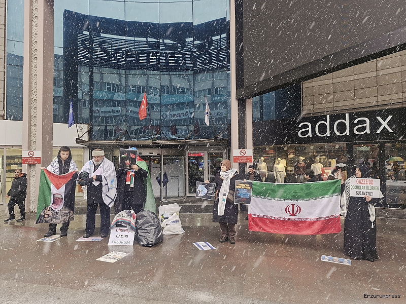 Erzurum Cumhuriyet Caddesi’nde bulunan bir AVM önünde, kadın, erkek ve çocuklardan oluşan kalabalık bir grup tarafından Gazze’de yaşananlara dikkat çekmek amacıyla protesto gösterisi düzenlendi. Gösteride, “Gazze ölüyor”, “İran direniyor, Türkiye izliyor”, “Sıra bize geliyor”, “Uyan, özgürleş” sloganları atıldı. Katılımcılar Filistin ve Türkiye bayrakları taşıdı.