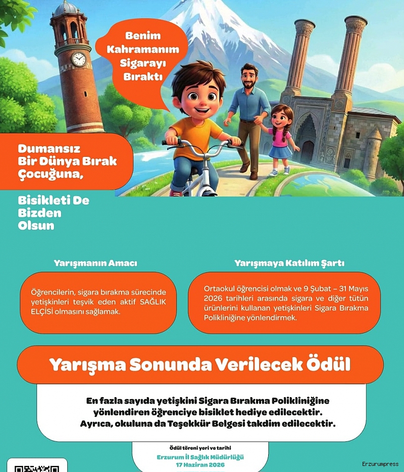 Erzurum İl Sağlık Müdürlüğü’nün hazırladığı, çocuk ve gençlerde sigara karşıtı farkındalık oluşturmak ve yetişkinleri sigarayı bırakmaya teşvik etmek amacıyla anlamlı bir yarışma hayata geçirildi. “Benim Kahramanım Sigarayı Bıraktı – Dumansız Bir Dünya Bırak, Bisikleti de Bizden Olsun” sloganıyla düzenlenen yarışma, ortaokul öğrencilerini kapsıyor.